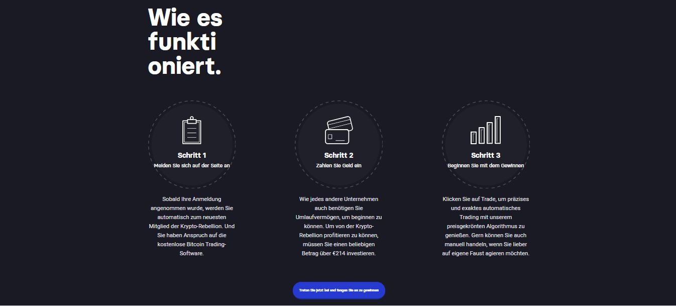 Die von dieser Plattform verwendeten Algorithmen sind leistungsstark und weisen eine Erfolgsrate von 88% auf. Das Demo-Konto steht den Händlern nach der Anmeldung zur Verfügung. Nach dem Kennenlernen der Plattform kann der Händler die Mindesteinzahlung vornehmen und mit dem Live-Handel fortfahren.