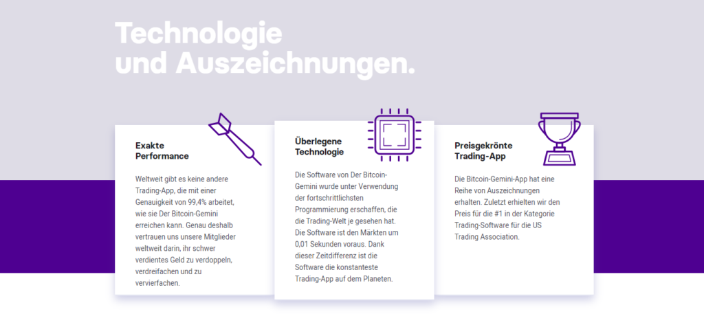 Eine der führenden Handelsplattformen für binäre Optionen ist Bitcoin Gemini. Es ist am besten für neue Händler geeignet, die keine Vorkenntnisse oder Kenntnisse im Handel haben. Laut ihrer offiziellen Website prognostiziert diese Software den Handel mit binären Optionen mithilfe eines einzigartigen intelligenten Algorithmus, der mit außerordentlicher Genauigkeit liefert. Folglich können Händler, die dies nutzen, täglich mehr als 1000 US-Dollar verdienen