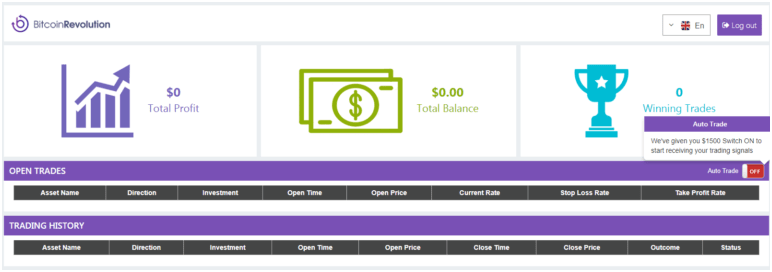 - “Open Transactions” – on this tab, you can manage all live transactions in real time. This feature is used by traders to monitor the trading activities of the Bitcoin Revolution at all times.