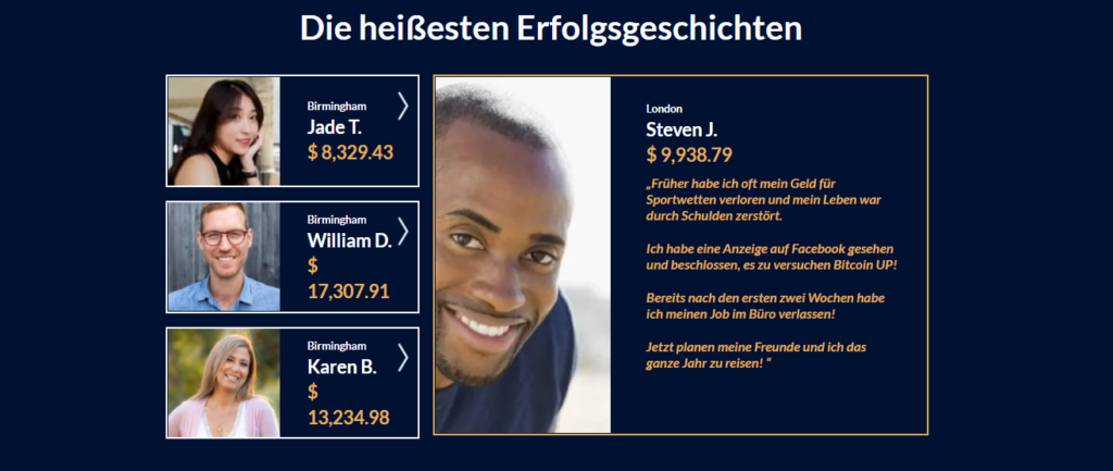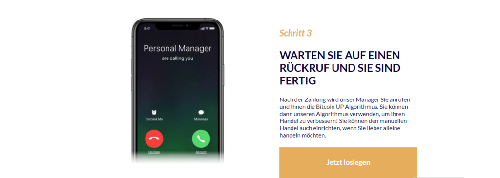 Bitcoin Up hat eine hohe Genauigkeit Rate und erwies mich als zu der Lage konstanten Gewinn durch seinen erzeugen geschickten High-End – Mustererkennungsalgorithmus. Die Mehrheit der Benutzer ist zufrieden und gibt an, dass die Leistung der Bitcoin Up- Software aktuell und zuverlässig ist. Es handelt sich um zuverlässige Software , die unter Berücksichtigung des Interesses professioneller Händler sowie eines neuen Händlers entwickelt wurde. Da es sich um eine vollautomatisierte Software handelt, ist sie überhaupt nicht schwierig zu handhaben und zu verwenden. Es soll allen im Handelsbereich zugute kommen und ist aufgrund seiner einfachen Funktionen äußerst praktisch. Experten von Bitcoin Up behaupten, dass diese Handelsplattform schneller ist als andere Roboter, die auf anderen Handelsplattformen eingesetzt werden. Es kann automatische Trades für Benutzer platzieren und liefert genaue und profitable Ergebnisse.