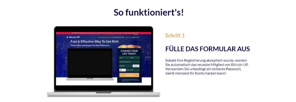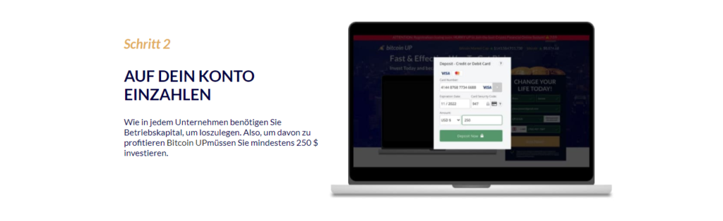 Um diese Software nutzen zu können, muss man sich zuerst auf der Bitcoin Up- Website registrieren und Geld auf die Bitcoin Up- Software einzahlen . Der Prozess ist sehr einfach und leicht.