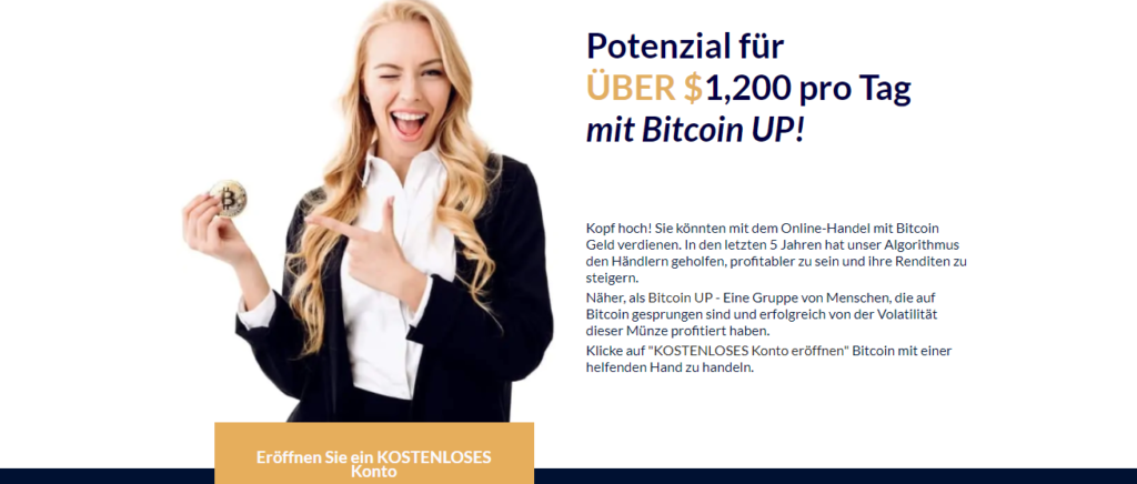 Bitcoin Up ist eine künstliche Intelligenz (KI) Trading – Software , die ist Experte bei der Durchführung von Handelsfunktionen mit großer Schnelligkeit durch das Scannen Kryptowährung Markt und entdecken erfolgreiche Handelssignale . Es ist eine automatische Trading – Roboter programmiert auszuführen alle Handelsaufgaben für seine Benutzer. Das heißt , der Benutzer nicht muß für lange Stunden vor dem Computer sitzen und er kann verwendet werden, die Zeit mit den Lieben.