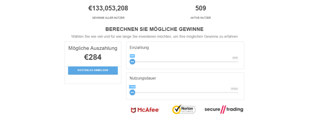 BitQT hat sich in unserer Studie wie Bitcoin Bank und Btcoin Future als legitim erwiesen, da es eine Genauigkeit von 99,4% behauptet und dem Markt, der die Marktbewegung früher untersucht und dementsprechend den Handel ausführt, 0,01 Sekunden voraus ist. BitQT bietet seinen Benutzern eine sehr benutzerfreundliche Plattform. Ein neuer Händler kann mit dem Handel mit BitQT beginnen, ohne vorher über Handelskenntnisse zu verfügen. Ein Benutzer kann mit einem Mindestbetrag von 250 USD mit dieser Software handeln. Diese Software behauptet, dass ein Benutzer mit dieser Handelssoftware einen täglichen Mindestgewinn von 1.100 USD erzielen kann.