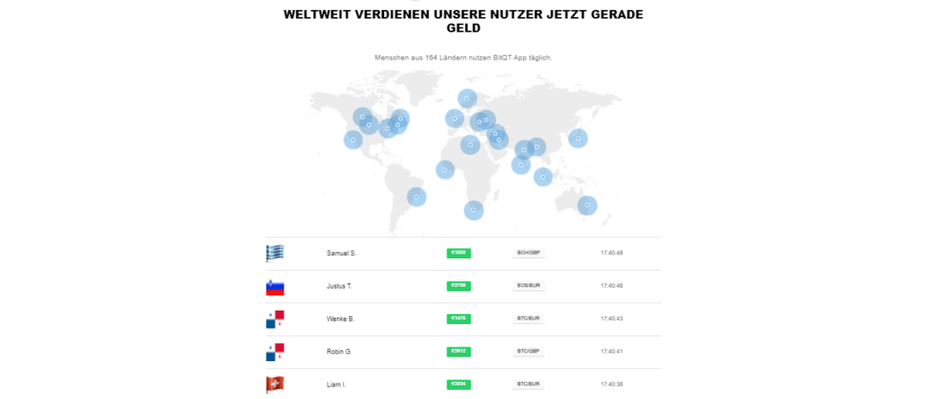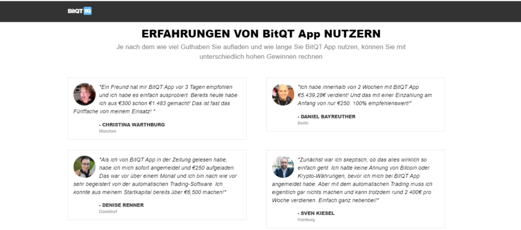 Benutzer haben auf der offiziellen Website des BitQT die Aussagen gemacht, dass Händler mit dieser Software enormes Geld verdienen. Es ist also kein Betrug.