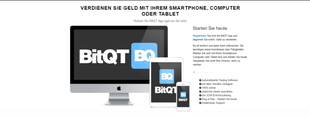BitQT bietet seinen Benutzern eine sehr benutzerfreundliche Plattform. Ein neuer Händler kann mit dem Handel mit BitQT beginnen, ohne vorher über Handelskenntnisse zu verfügen. Ein Benutzer kann mit einem Mindestbetrag von 250 USD mit dieser Software handeln. Diese Software behauptet, dass ein Benutzer mit dieser Handelssoftware einen täglichen Mindestgewinn von 1.100 USD erzielen kann.