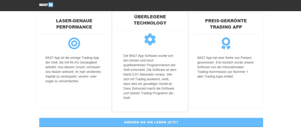 BitQT ist ein automatisierter Handelsroboter, der auf künstlicher Intelligenz basiert. BitQT ist legitim, da es eine Genauigkeit von 99,4% beansprucht. Es beansprucht eine 100% gesicherte Plattform für seine Benutzer und gibt die Daten seiner Benutzer nicht an Dritte weiter. Es behauptet, ein Leben lang 100% kostenlos zu sein. Es funktioniert wie Bitcoin System und Bitcoin Trend.