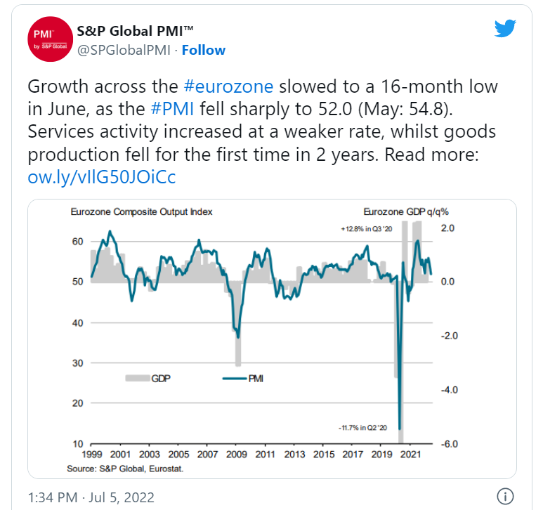 Der sorgfältig beobachtete monatliche Purchasing Manager Index (PMI), ein Maß für den Optimismus der Unternehmen, fiel von 54,8 im Mai auf 52,0 im Juni, laut den am Dienstag veröffentlichten Umfragedaten von S&P Global.