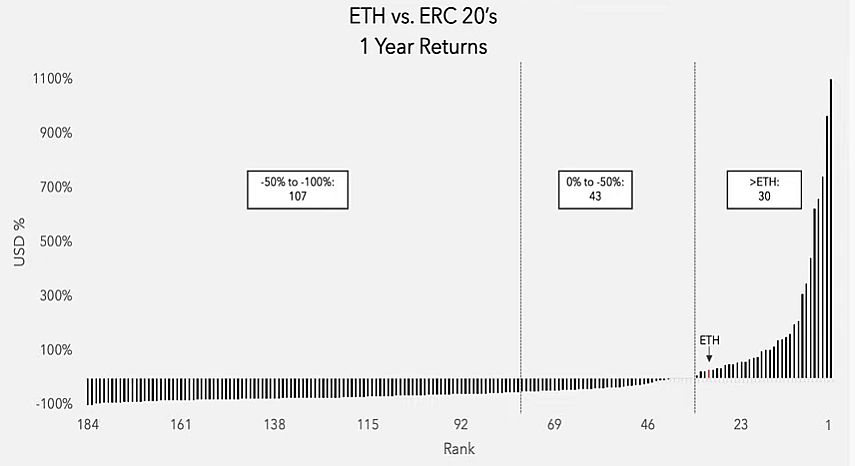 Angesichts der Renditen von ERC 20-Token im letzten Jahr schien der Markt auch dezentralen Marktplätzen einen hohen Stellenwert einzuräumen. Nur 30 ERC 20-Token übertrafen Ethereum im letzten Jahr tatsächlich. Ganz oben auf dieser Liste stehen Kunststoffe, die die dezentrale Terminbörse befeuern. Wir haben Khyber, das den dezentralen Austausch zwischen vielen verschiedenen Anbietern fördert, Eastland, das natürlich mit Defi-Darlehen zusammenarbeitet, und Chainlink, das offensichtlich das Blockchains-Äquivalent einer Datenpipeline ist, aber die Auswahl der richtigen Krypto ist eine schwierige Aufgabe, da diese 30 Kryptos zwar eine Outperformance aufweisen Ethereum, 150 verschiedene ERC 20-Token, verzeichnete entweder keine Gewinne, was bedeutet, dass sie vollständig fehlgeschlagen sind.