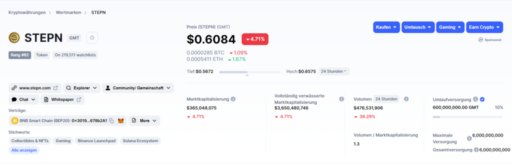 Am 15. Juni 2022 wird STEPN (GMT) bei etwa 0,60 $ gehandelt. An den Börsen beträgt das 24-Stunden-Handelsvolumen etwa 479.283.779 $.