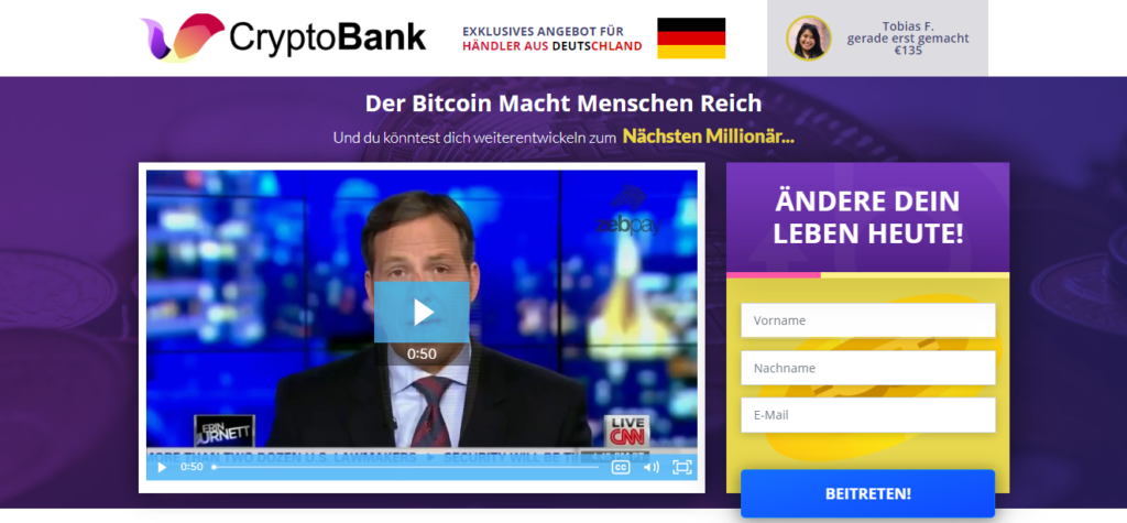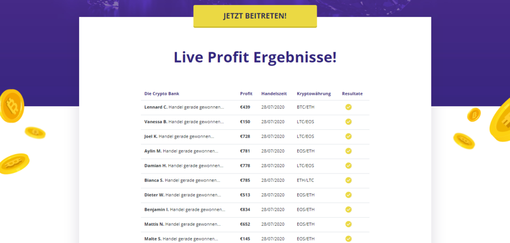 • Auf der offiziellen Website der Crypto Bank finden Sie so viele Testimonials. Sie haben ihre lebensverändernden Erfahrungen mit dieser Plattform geteilt. Investoren profitieren von dieser Krypto-Software.