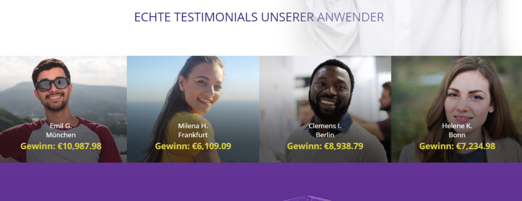 • Gemäß den Testimonials auf der Website ist diese Anwendung benutzerfreundlich und arbeitet in einem automatisierten Modus. Seine Programmierung nimmt das richtige Signal wahr und setzt dann seine Investitionen fort, was zu Gewinnen führt. Investoren müssen nicht in Vollzeit verfügbar sein.