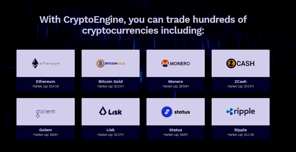 • Die Crypto Engine-Plattform bietet verschiedene Kryptowährungen wie Bitcoin, Bitcoin Gold, Ethereum, Zcash, Monero, Ripple und Golem für den Handel.