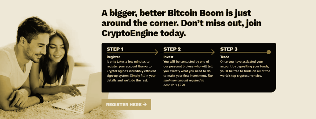 • Der Einstieg in die Crypto Engine-Plattform ist einfach. Nach einigen einfachen Schritten kann der Benutzer den Live-Handel erleben und sehen, wie sein Geld automatisch wächst. Der Benutzer muss mindestens 250 USD einzahlen, um mit dem Handel auf der Plattform zu beginnen.