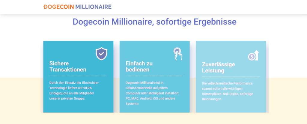 Dogecoin Millionaire ist bei Händlern, die sich für die DOGE-Kryptowährung interessieren, sehr beliebt. Die Plattform ist einzigartig, die Händler in DOGE investieren können. Einige Vorteile dieser Handelsplattform sind-