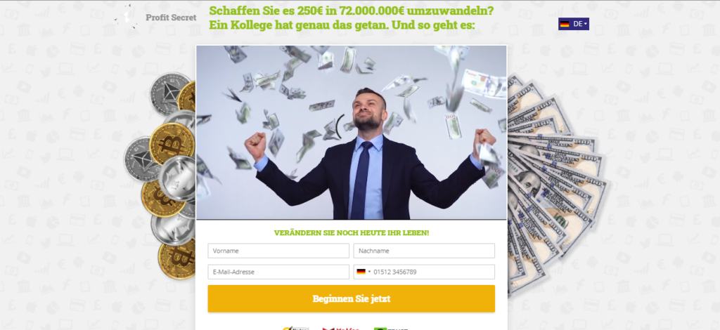Profit Secret ist legitim, da es eine Gewinnquote von 90% auf dieser Plattform behauptet. Diese Handelsanwendung wird in der aktuellen Zeit immer berühmter, da sie behauptet, täglich 300% Gewinn zu erzielen. Ein Benutzer kann mit der Mindestinvestition von 250 Dollar täglich bis zu 1500 Dollar verdienen. Sie haben Interviews mit vielen Investoren gesehen, die mit Profit Secret verbunden sind. Aber ist das wahr?