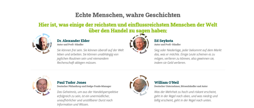 Wir haben herausgefunden, dass Profit Secret kein Betrug ist, da Benutzer auf der offiziellen Website des Unternehmens ausgesagt haben, dass sie mit Profit Secret riesige Gewinne erzielen und sich ihr Leben nach dieser Handelssoftware verändert hat. Profit Secret hat sich mit professionellen Brokern zusammengetan, die den Handel im Namen der Benutzer abwickeln.