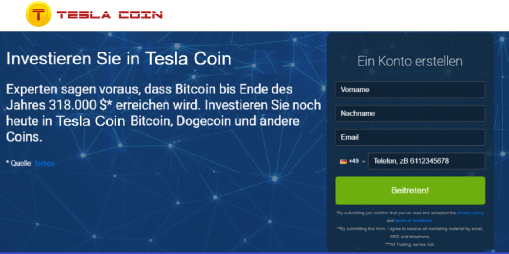 TeslaCoin behauptet, eine wirkungsvolle Alternative in Form einer einfachen und unkomplizierten Methode zum Austausch von Digital Tesla anzubieten. Sie können den Einrichtungsprozess schnell abschließen und mit dem Handel mit Ihren digitalen Vermögenswerten beginnen, unabhängig davon, ob Sie die Website auf einem Laptop oder Smartphone verwenden. Im Moment können Sie sich kostenlos bei TeslaCoin anmelden, um zu sehen, ob Ihnen das Angebot gefällt. Benutzer sollten jedoch ausreichend recherchieren, bevor sie diese oder eine andere Handelsplattform nutzen.